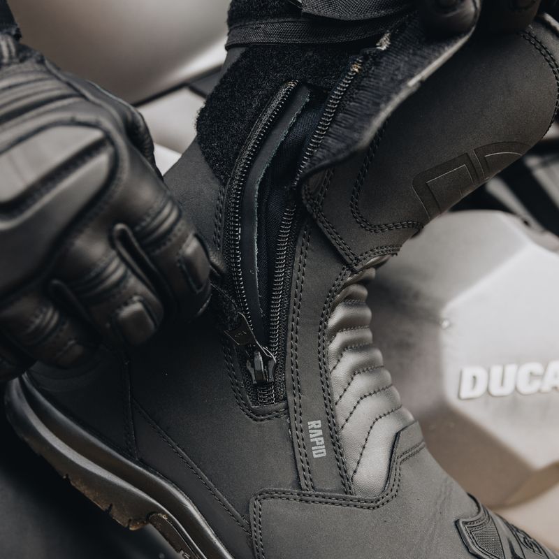 Skórzane buty motocyklowe z gumową podeszwą i wyściółką poliester mesh. Mają w wodoodporną, oddychającą membranę HIPORA, usztywniony czubek oraz wzmocnienie pod dźwignię zmiany biegów. Zapinane na obustronny zamek i rzep. Antybakteryjna wkładka i elastyczne panele zwiększają komfort użytkowania.