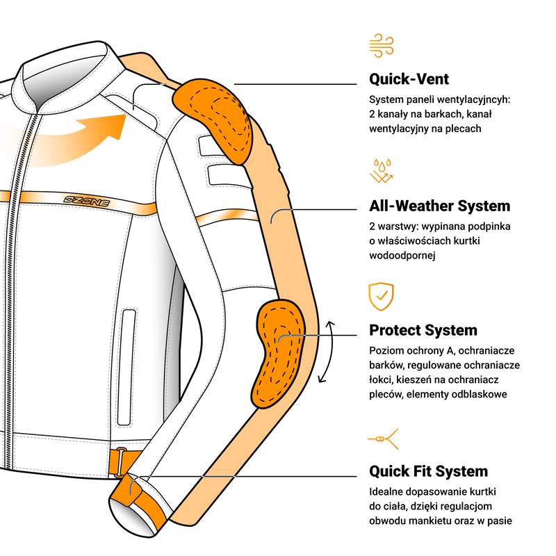 Ozone Rider to wielosezonowa miejska kurtka motocyklowa, która została wykonana z certyfikowanego, wytrzymałego poliestru. Za bezpieczeństwo motocyklisty odpowiadają ochraniacze barków i łokci CE-Level 1 oraz elementy reflective. Posiada wypinaną podpinkę ocieplającą o właściwościach kurtki wodoodpornej, co znacząco poprawia komfort oraz podkreśla wszechstronne zastosowanie kurtki, niezależnie od pogody.
