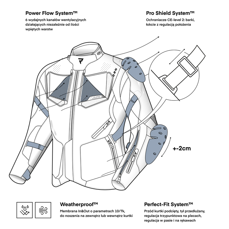 - 2 duże otwierane panele wentylacyjne na przedniej części kurtki