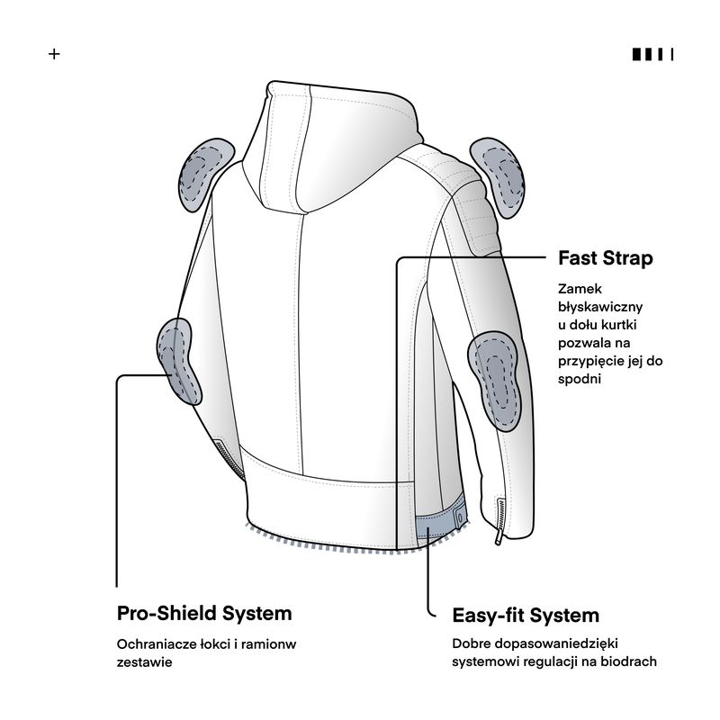 BEZPIECZEŃSTWO: Bezpieczeństwo zapewniają certyfikowane ochraniacze łokci i barków oraz podwójne i potrójne szwy zwiększające wytrzymałość materiału.